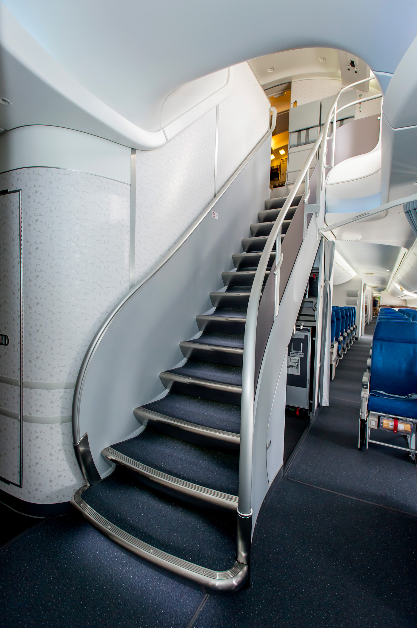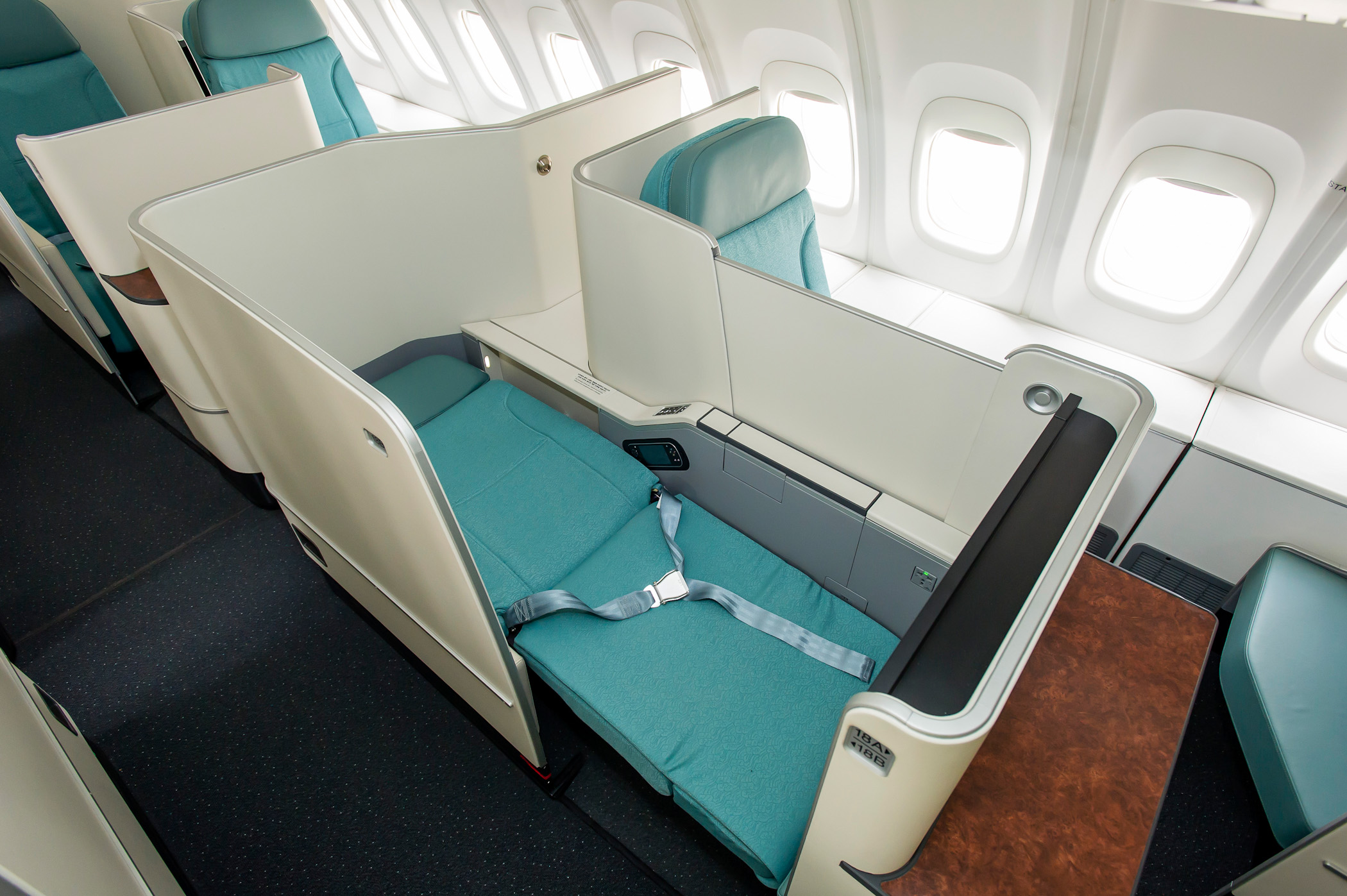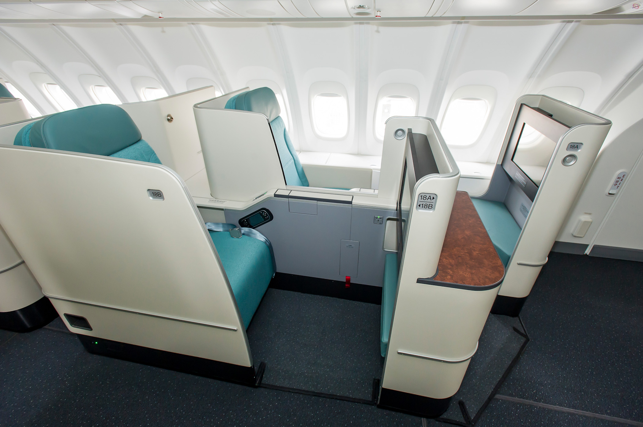 Korean Air's jet is configured with 368 seats and features the brand new First Class Kosmo Suite 2.0, which include a sliding door and higher partitions to provide added privacy for passengers. The suites are also equipped with updated in-flight entertainment systems, with large 24-inch high-definition monitors and new handheld touch remotes.