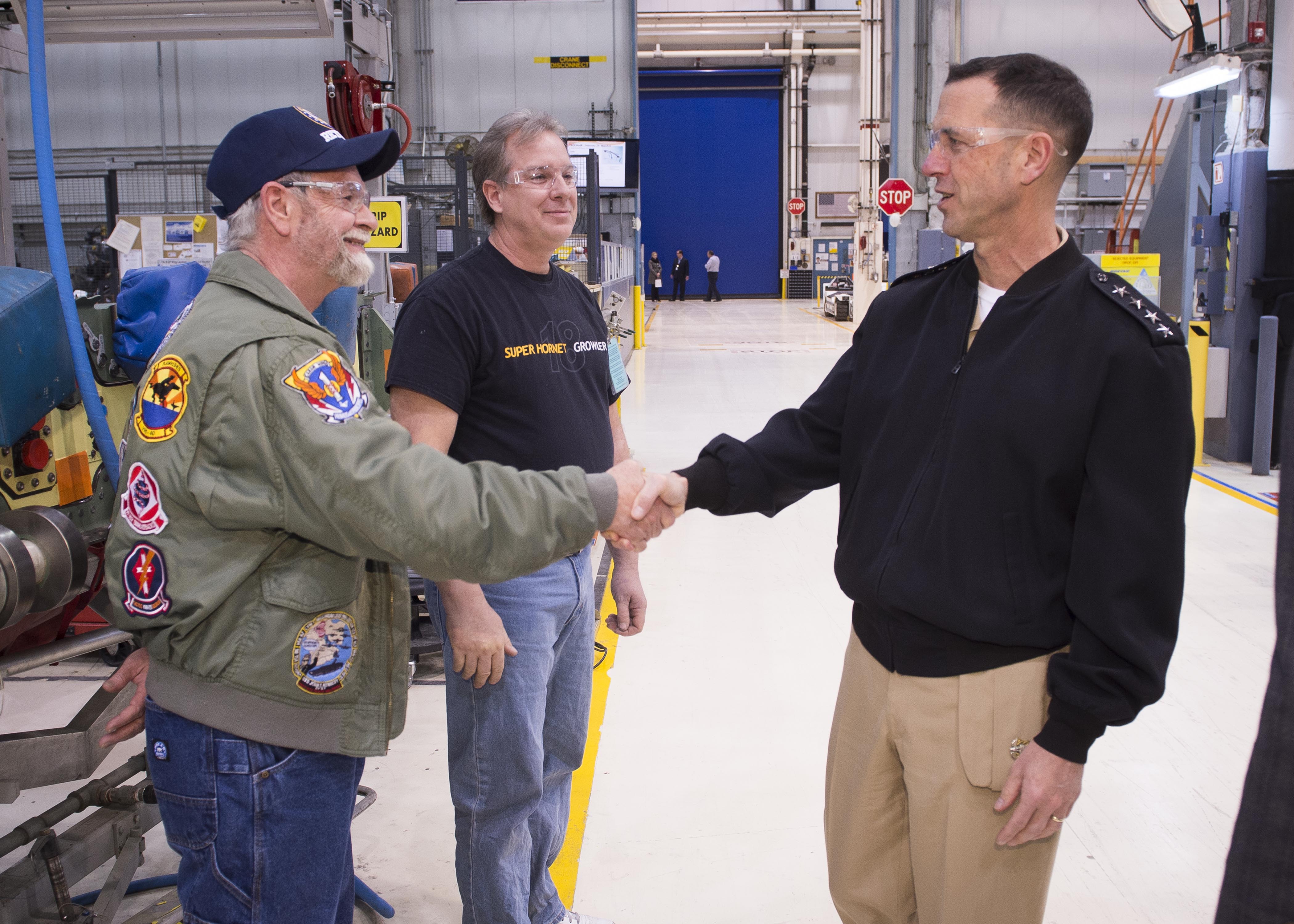 “It was great to have the chance to meet the CNO because my son is active duty Navy and I’m a retired veteran myself,” said Bill Loggins, F/A-18 assembly foreman. “I loved the airplanes when I worked on them in the fleet and it’s a joy knowing the people in the fleet are flying what I work on today.”