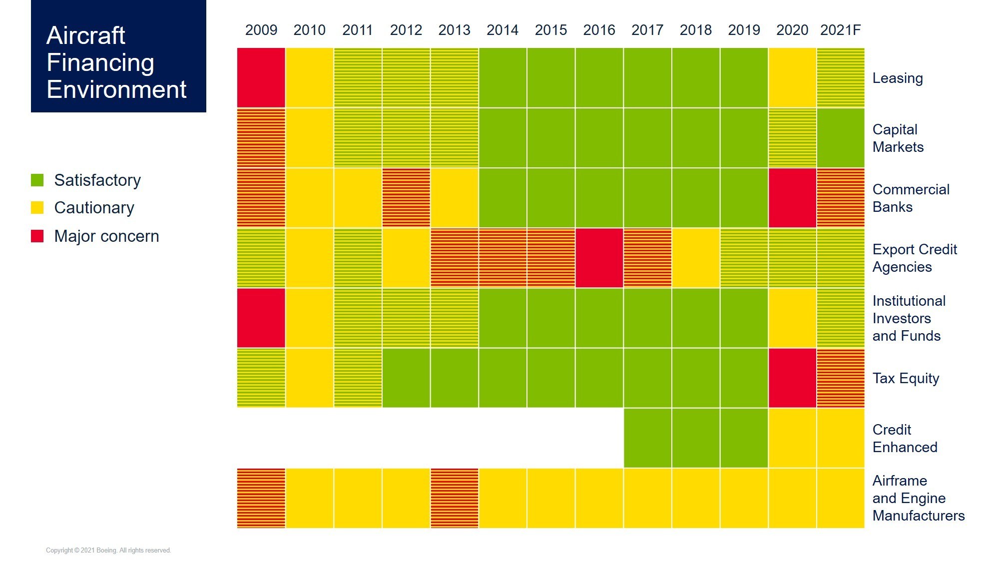 The 2021 Current Aircraft Finance Market Outlook (CAFMO), the first published since 2019, reflects Boeing's near-term view of market dynamics and assesses financing sources for new commercial airplane deliveries. Due to the ongoing impacts of the pandemic, the 2021 CAFMO excludes its customary one- and five-year industry financing projections.