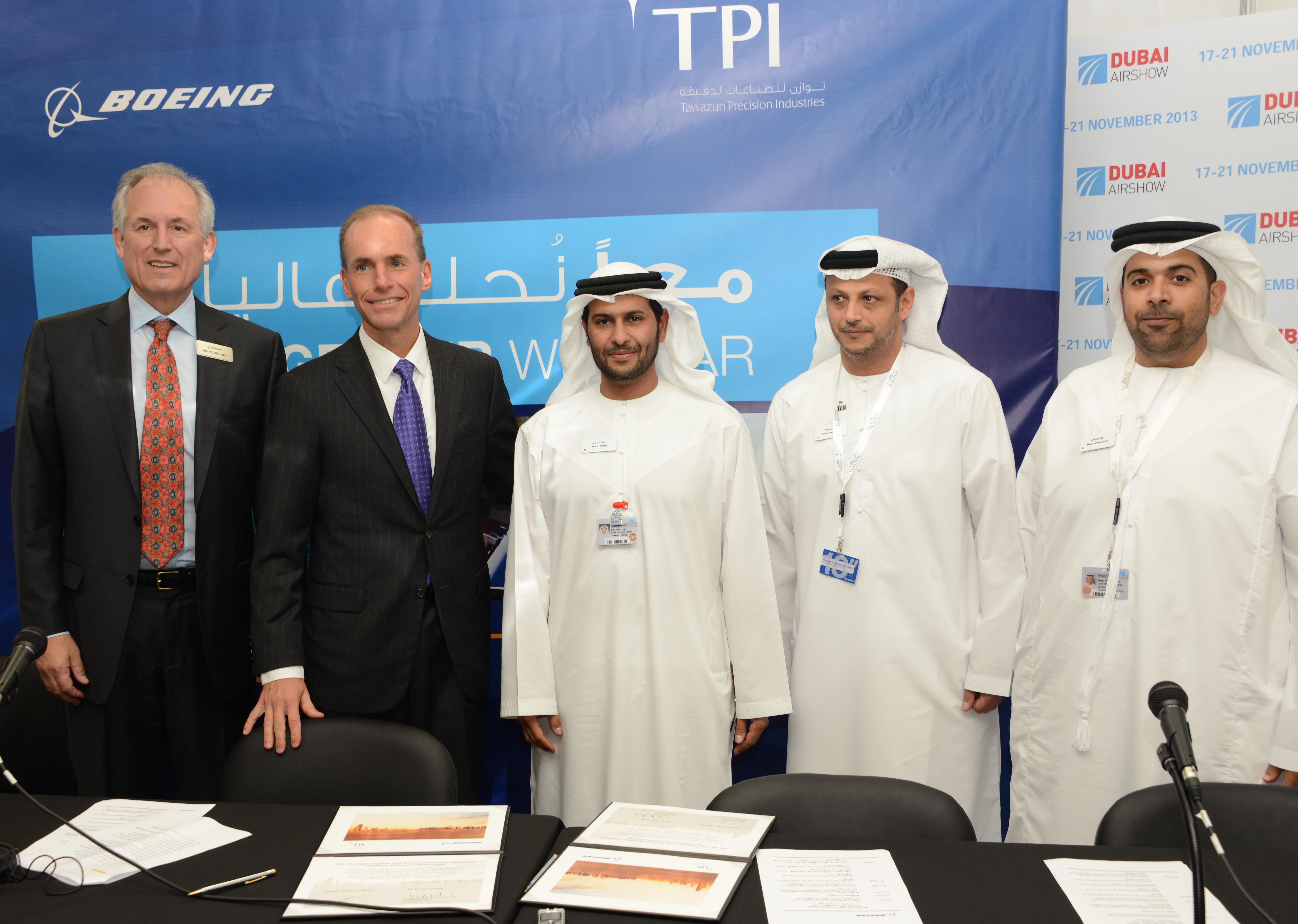 DUBAI, United Arab Emirates, Nov. 18, 2013 – Boeing [NYSE: BA] will partner with Tawazun Precision Industries (TPI), a Tawazun Holding subsidiary, to establish a production aerospace surface treatment facility in the United Arab Emirates (UAE). In a joint announcement with Tawazun today at the Dubai Airshow, company representatives said this partnership introduces a new aerospace manufacturing capability in the Middle East region.