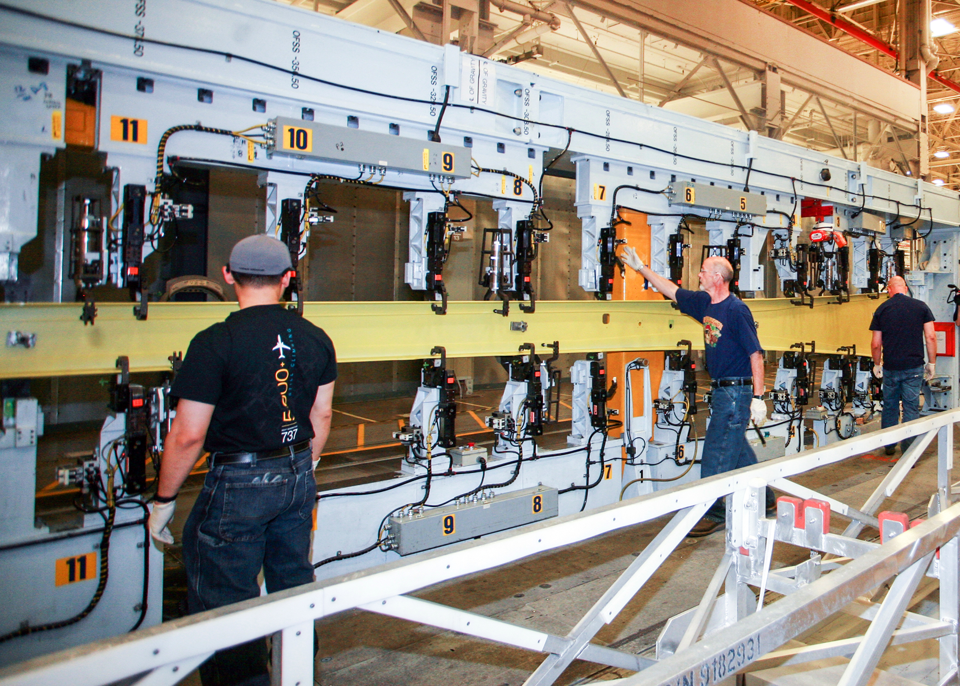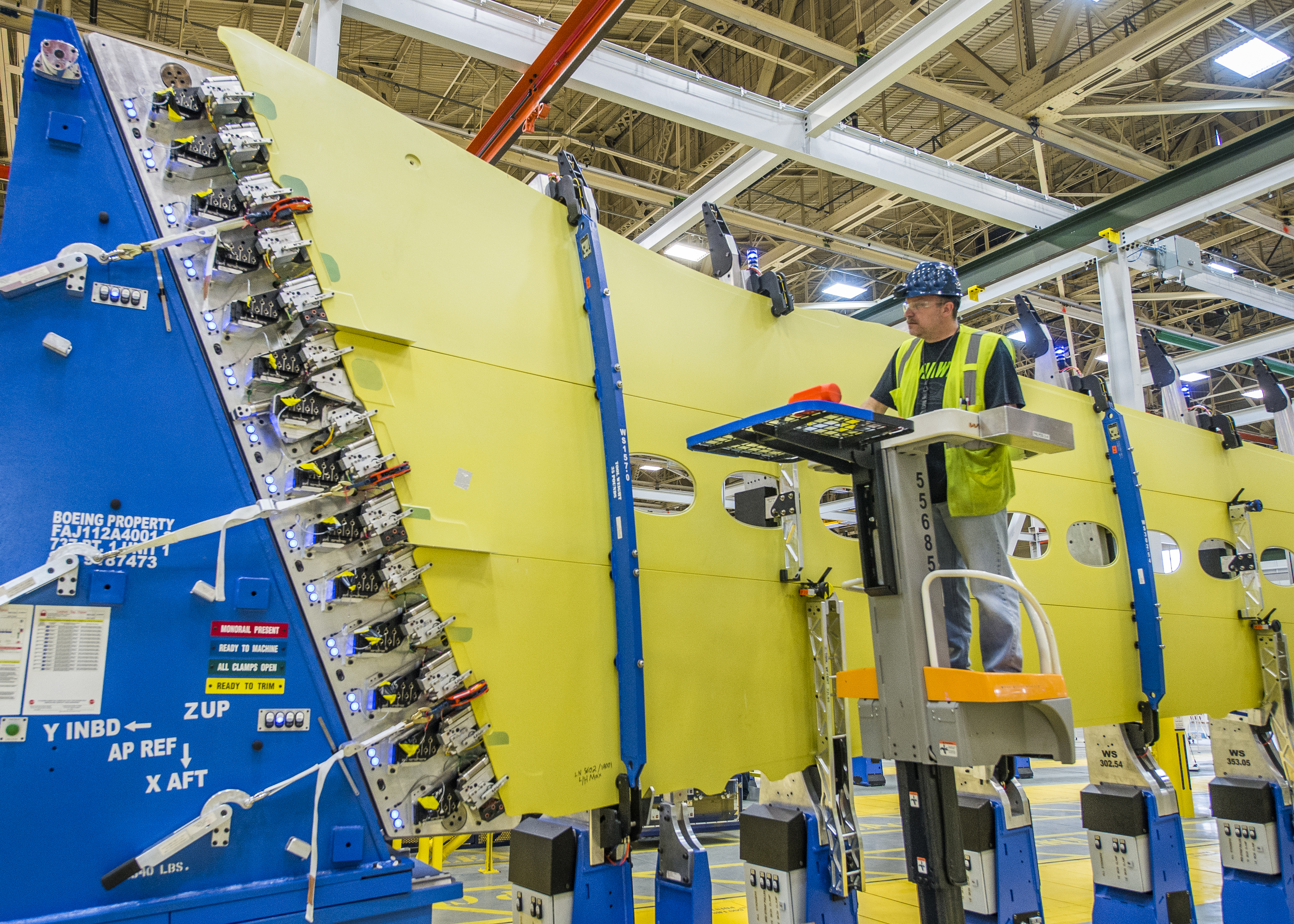 Machine operators loaded 737 MAX wing skin panels and stringers into the new panel assembly line that uses automation to drill holes and install fasteners in the upper and lower wing panels. Mechanics also loaded the initial parts of the first 737 MAX spars – internal support structures in wings – into automated spar assembly machines. The unfinished skins, stringers and spars were machined by Boeing Fabrication Skin and Spar in Auburn and Fredrickson, Wash. When finished, the panels and spars will be transformed into completed wings.