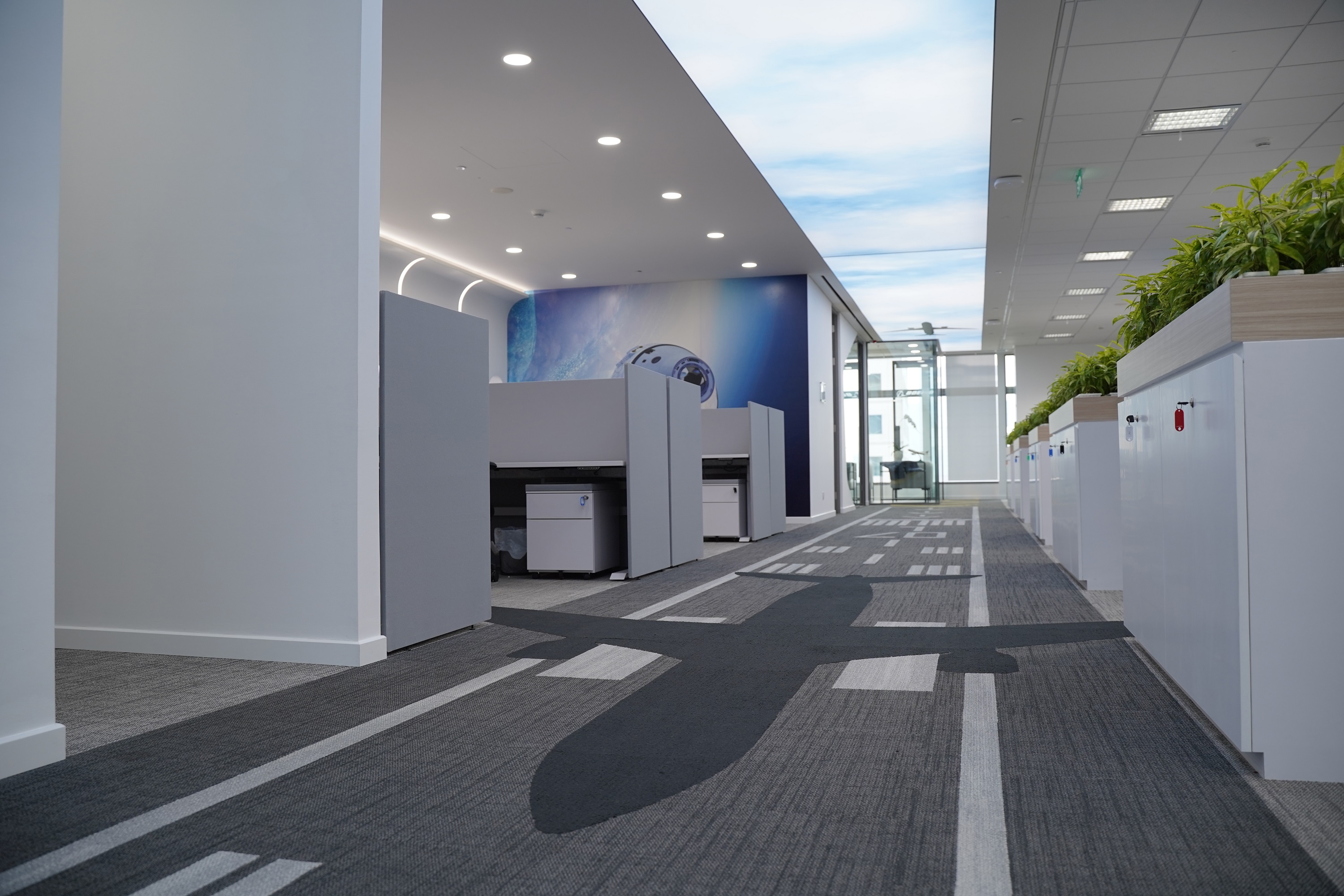 The new Boeing Indonesia office, located in Jakarta’s central business district, features traditional batik designs combined with artwork and imagery of Boeing products. The office was influenced by Boeing's Indonesian employees to create a collaborative, innovative work environment.